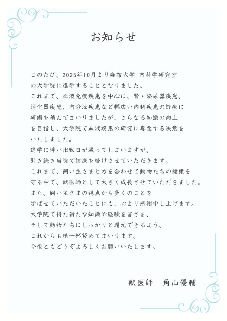 獣医師角山 出勤日変更のお知らせ【2025年10月~】